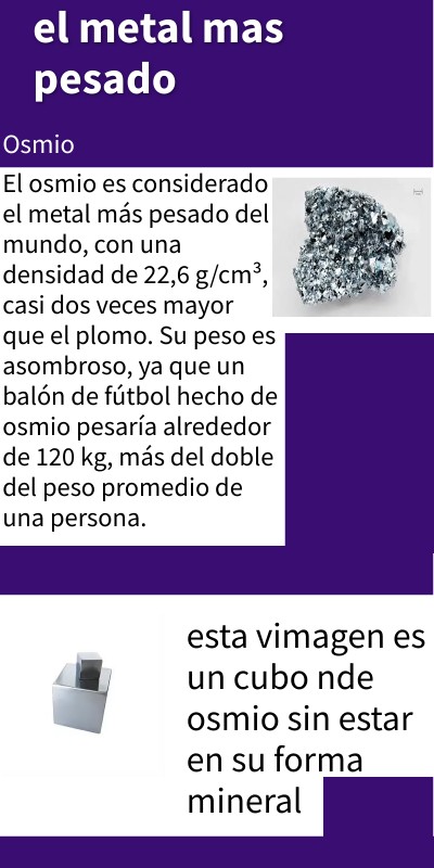 El osmio es considerado el metal más pesado del mundo, con una densidad de 22,6 g/cm³, casi dos veces mayor que el plomo. Su peso es asombroso, ya que un balón de fútbol hecho de osmio pesaría alrededor de 120 kg, más del doble del peso promedio de una persona.