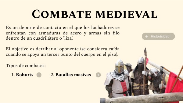 Es un deporte de contacto en el que los luchadores se enfrentan con armaduras de acero y armas sin filo dentro de un cuadrilátero o ‘liza’. El objetivo es derribar al oponente (se considera caída cuando se apoya un tercer punto del cuerpo en el piso).