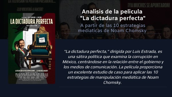 "La dictadura perfecta," dirigida por Luis Estrada, es una sátira política que examina la corrupción en México, centrándose en la relación entre el gobierno y los medios de comunicación. La película proporciona un excelente estudio de caso para aplicar las 10 estrategias de manipulación mediática de Noam Chomsky.