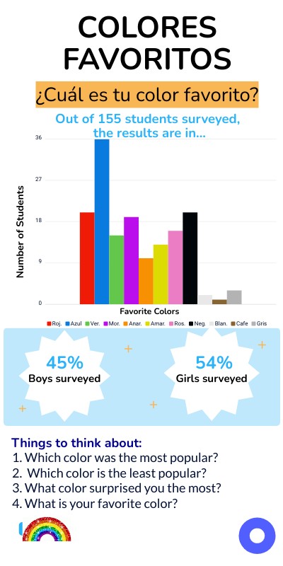 1. Which color was the most popular? 2. Which color is the least popular? 3. What color surprised you the most? 4. What is your favorite color?