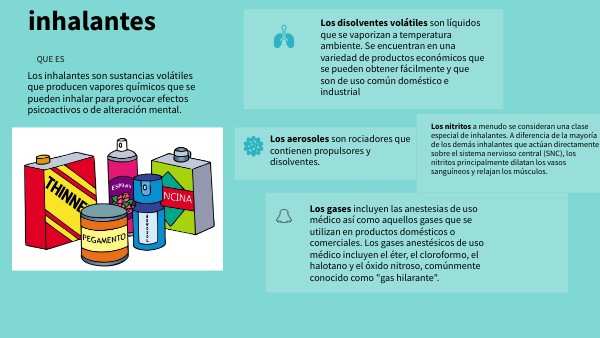 Los inhalantes son sustancias volátiles que producen vapores químicos que se pueden inhalar para provocar efectos psicoactivos o de alteración mental.