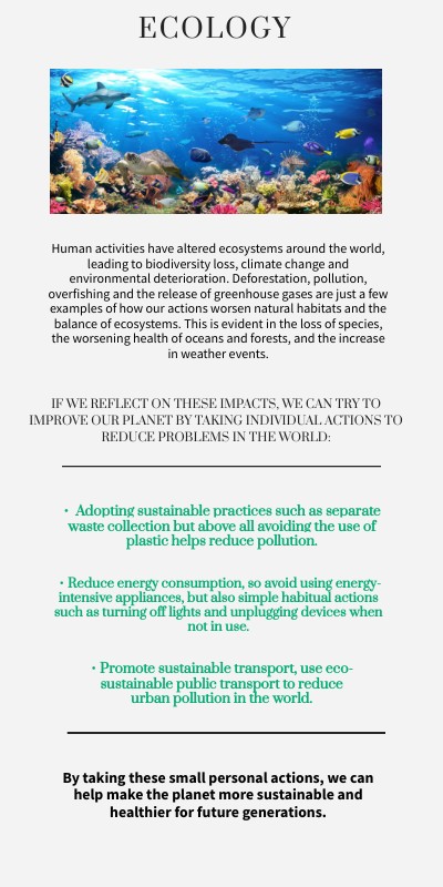 Human activities have altered ecosystems around the world, leading to biodiversity loss, climate change and environmental deterioration. Deforestation, pollution, overfishing and the release of greenhouse gases are just a few examples of how our actions worsen natural habitats and the balance of ecosystems. This is evident in the loss of species, the worsening health of oceans and forests, and the increase in weather events.