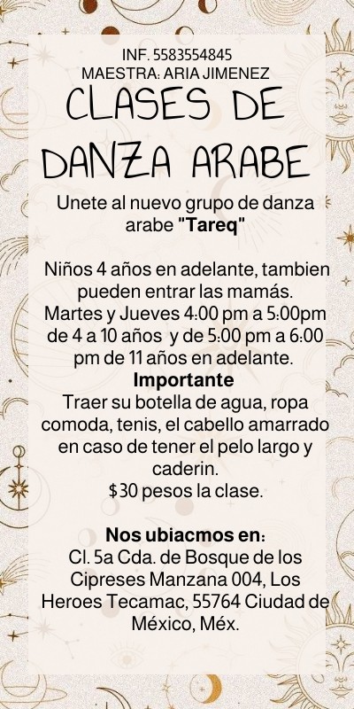 Unete al nuevo grupo de danza arabe "Tareq" Niños 4 años en adelante, tambien pueden entrar las mamás.Martes y Jueves 4:00 pm a 5:00pm de 4 a 10 años y de 5:00 pm a 6:00 pm de 11 años en adelante. Importante Traer su botella de agua, ropa comoda, tenis, el cabello amarrado en caso de tener el pelo largo y caderin.$30 pesos la clase. Nos ubiacmos en: Cl. 5a Cda. de Bosque de los Cipreses Manzana 004, Los Heroes Tecamac, 55764 Ciudad de México, Méx.
