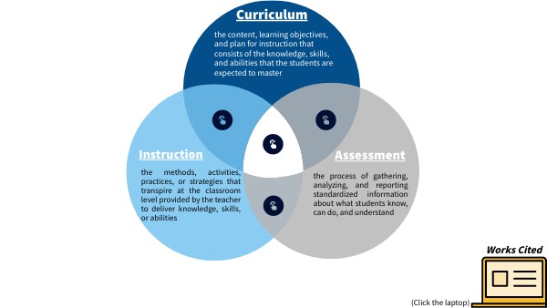 Bunch, M. (2012). Aligning Curriculum, Instruction, and Assessment. Formative, Interim, and Summative Assessment: It Takes All Three. https://measurementinc.com/sites/default/files/2017-08/Aligning Curriculum, Assessment, and Instruction (M. Bunch, 2012).pdf Commonwealth of Pennsylvania. (n.d.). Assessment and Instruction Interconnectedness. https://pdcenter.pdesas.org/CourseRendering/CourseContent/Render/040150021171047102214092225010054132175136008239 Wells, M., & Clayton, C. (2021). Chapter 6: Curriculum: Planning, Assessment, & Instruction. Foundations of American Education A Critical Lens. https://viva.pressbooks.pub/foundationsofamericaneducation/chapter/chapter-6/#3