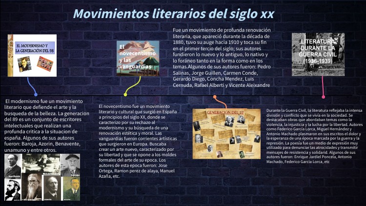 El novecentismo fue un movimiento literario y cultural que surgió en España a principios del siglo XX, donde se caracterizo por su rechazo al modernismo y su búsqueda de una renovación estética y moral. Las vanguardias fueron corrientes artísticas que surgieron en Europa. Buscaba crear un arte nuevo, caracterizado por su libertad y que se opone a los moldes formales del arte de su epoca. Los autores de esta epoca fueron: Jose Ortega, Ramon perez de alaya, Manuel Azaña, etc.