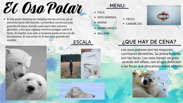 - El oso polar domina las heladas tierras articas, en el extremo norte del mundo. La hembra construye una guarida de nieve donde suele parir dos oseznos gemelos, a los que vigilara mientras juegan sobre el hielo. El macho vive solo y no toma parte en la cria de los oseznos. El oso polar es el oso mas grande del mundo