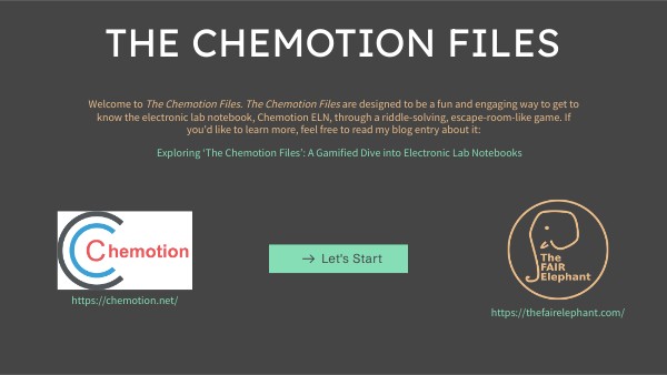 Welcome to The Chemotion Files. The Chemotion Files are designed to be a fun and engaging way to get to know the electronic lab notebook, Chemotion ELN, through a riddle-solving, escape-room-like game. If you'd like to learn more, feel free to read my blog entry about it:
