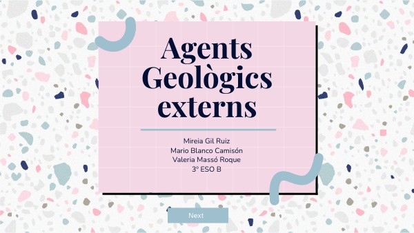 1- AIGUA 1.1 Rius 1.2 Torrents 1.3 Aigües d'escorrrentia 1.4 Aigües subterrànies 1.5 Oceans i mars 1.6 Informació extra 2- VENT 2.1 Tornados 2.2 Funcions i processos geològics - Erosió eòlica - Sedimentació - Transport eòlic 3-ÈSSERS VIUS 3.1 Procés de meteorització 3.2 Formació de roques sedimantàries 3.3 Fauna España 3.4 Animals exòtics