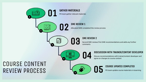 PD team will make chnages to the course materials for internal courses and eLearning External trainers will update their courses with the agreed changes, ready for delivery within one month Course delivery dates will be taken into consideration as part of this process