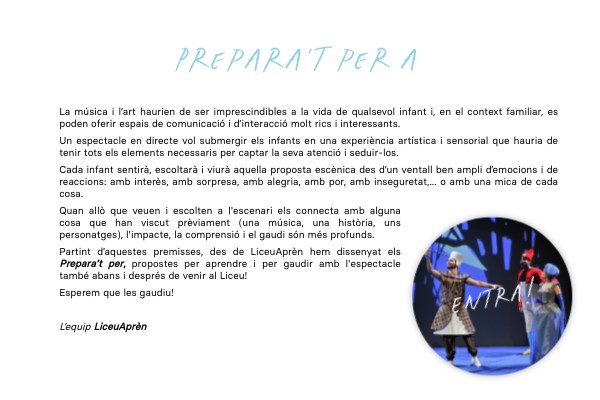Quan allò que veuen i escolten a l'escenari els connecta amb alguna cosa que han viscut prèviament (una música, una història, uns personatges), l'impacte, la comprensió i el gaudi són més profunds. Partint d’aquestes premisses, des de LiceuAprèn hem dissenyat els Prepara’t per, propostes per aprendre i per gaudir amb l'espectacle també abans i després de venir al Liceu! Esperem que les gaudiu! L’equip LiceuAprèn