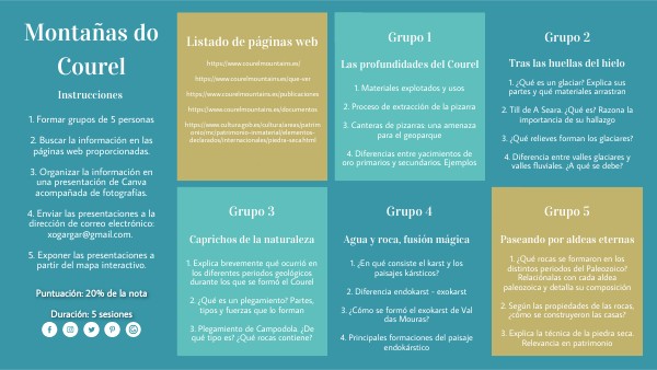 1. Formar grupos de 5 personas2. Buscar la información en las páginas web proporcionadas. 3. Organizar la información en una presentación de Canva acompañada de fotografías. 4. Enviar las presentaciones a la dirección de correo electrónico: xogargar@gmail.com. 5. Exponer las presentaciones a partir del mapa interactivo.