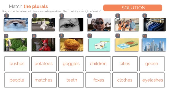 Drag and put the pictures with the corresponding plural form. Then check if you are right in "solution".