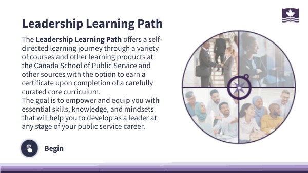 The Leadership Learning Path offers a self-directed learning journey through a variety of courses and other learning products at the Canada School of Public Service and other sources with the option to earn a certificate upon completion of a carefully curated core curriculum. The goal is to empower and equip you with essential skills, knowledge, and mindsets that will help you to develop as a leader at any stage of your public service career.