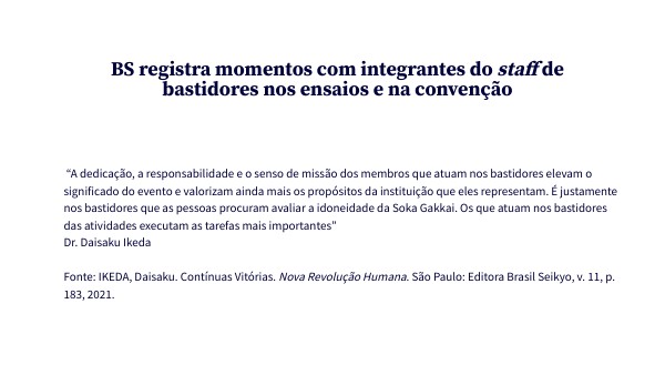 “A dedicação, a responsabilidade e o senso de missão dos membros que atuam nos bastidores elevam o significado do evento e valorizam ainda mais os propósitos da instituição que eles representam. É justamente nos bastidores que as pessoas procuram avaliar a idoneidade da Soka Gakkai. Os que atuam nos bastidores das atividades executam as tarefas mais importantes” Dr. Daisaku Ikeda Fonte: IKEDA, Daisaku. Contínuas Vitórias. Nova Revolução Humana. São Paulo: Editora Brasil Seikyo, v. 11, p. 183, 2021.