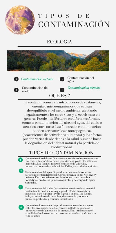 La contaminación es la introducción de sustancias, energía o microorganismos que causan desequilibrio en el medio ambiente, afectando negativamente a los seres vivos y al ecosistema en general. Puede manifestarse en diferentes formas, como la contaminación del aire, del agua, del suelo o acústica, entre otras. Las fuentes de contaminación pueden ser naturales o antropogénicas (provenientes de actividades humanas), y los efectos pueden variar desde daños a la salud humana hasta la degradación del hábitat natural y la pérdida de biodiversidad.