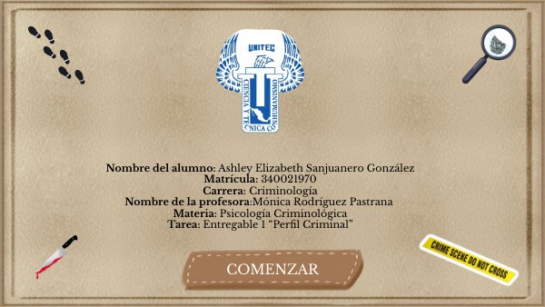 Nombre del alumno: Ashley Elizabeth Sanjuanero González Matrícula: 340021970 Carrera: Criminología Nombre de la profesora:Mónica Rodríguez Pastrana Materia: Psicología Criminológica Tarea: Entregable 1 “Perfil Criminal”