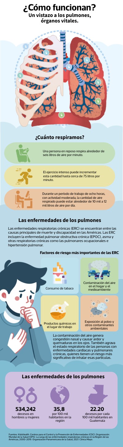 Fuentes: KidsHealth. Centros para el Control y la Prevención de Enfermedades (CDC). Organización Mundial de la Salud (OPS). La carga de las enfermedades respiratorias crónicas en la Región de las Américas, 2000-2019. Organización Panamericana de la Salud, 2021. Clínica Mayo.