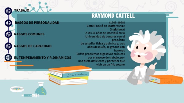 (1905-1998) Cattell nació en Staffordshire (Inglaterra) A los 16 años se inscribió en la Universidad de Londres con el propósito de estudiar física y química y, tres años después, se graduó con honores Sufrió problemas digestivos crónicos por el exceso de trabajo, por una dieta deficiente y por tener que vivir en un frío sótano