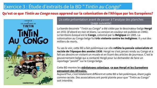 La bande dessinée "Tintin au Congo" a été créée par le dessinateur belge Hergé en 1931 (d'abord en noir et blanc. La version en couleur est publiée en 1946).Le territoire évoqué est le Congo, colonisé par la Belgique en 1885. La colonisation au Congo belge fut très violente contre les indigènes. Il y eut des milliers de morts. Tu vas le voir, cette BD a fait polémique car elle reflète la pensée colonialiste et raciste de l'époque des années 1930. Hergé ne s'est jamais rendu au Congo et a fait ses dessins en visitant un musée et en lisant des articles de journaux. C'est le gouvernement belge qui a contacté Hergé pour lui demander de faire un reportage "positif" sur le Congo belge. Cette BD montre les stéréotypes coloniaux, ce que Hergé et les Européens pensaient des Africains. Aujourd'hui, c'est totalement différent et cette BD a fait polémique, étant jugée comme raciste. Des associations ont porté plainte pour que "Tintin au Congo" soit interdite.