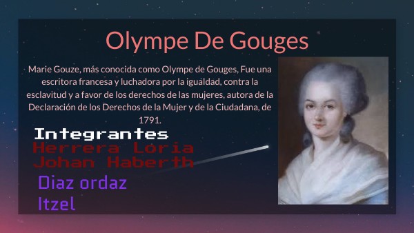 Virgili, U. R. I. (s. f.). Olympe De Gouges | Mujeres filósofas | Mujeres y ciencias | Año de las Mujeres y las Ciencias | Unidad de Igualdad | Soporte y servicios | Vida en el campus | Universitat Rovira i Virgili. Universitat Rovira I Virgili. https://www.urv.cat/es/vida-campus/servicios/unidad-igualdad/ano-mujeres-ciencias/dones-i-ciencies/dones-filosofes/olympedegougesl/ Marie Gouze, Olympe de Gouges autora de la Declaración de los derechos de la Mujer y de la Ciudadana | Comisión Nacional de los Derechos Humanos - México. (s. f.). https://www.cndh.org.mx/noticia/marie-gouze-olympe-de-gouges-autora-de-la-declaracion-de-los-derechos-de-la-mujer-y-de-la