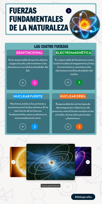 Fuerzas Fundamentales de la Naturaleza: https://www.raco.cat/index.php/Buran/article/download/176846/240221 Fuerza Gravitacional: https://www.fisicalab.com/apartado/fuerza-gravitatoria Fuerza Electromagnética: https://www.nationalgeographic.com.es/ciencia/leyes-maxwell-cuatro-ecuaciones-que-explican-electromagnetismo_21633 Fuerza Nuclear Fuerte: https://www.usc.gal/genp/docencia/tema2.pdf Fuerza Nuclear Débil: https://landau.unex.es/~sphinx/juanjo/Archivos/FII/Tema_6.pdf