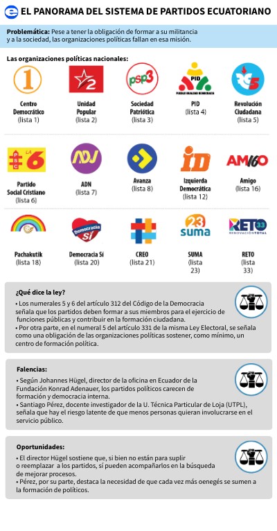 • Según Johannes Hügel, director de la oficina en Ecuador de la Fundación Konrad Adenauer, los partidos políticos carecen de formación y democracia interna. • Santiago Pérez, docente investigador de la U. Técnica Particular de Loja (UTPL), señala que hay el riesgo latente de que menos personas quieran involucrarse en el servicio público.