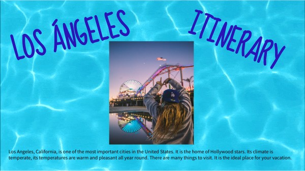Los Angeles, California, is one of the most important cities in the United States. It is the home of Hollywood stars. Its climate is temperate, its temperatures are warm and pleasant all year round. There are many things to visit. It is the ideal place for your vacation.