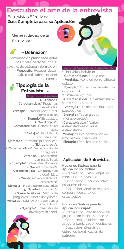 Según su Estructura:1. *Dirigida*: Características*: Preguntas predefinidas. - *Ventajas*: Estandarización, fácil comparación. - *Ejemplo*: Encuestas. 2. *No dirigida*: - *Características*: Conversación libre. - *Ventajas*: Flexibilidad, profundización. - *Ejemplo*: Entrevistas periodísticas. 3. *Estructurada*: - *Características*: Secuencia fija de preguntas. - *Ventajas*: Consistencia, comparabilidad. - *Ejemplo*: Entrevistas laborales. 4. *No estructurada*: - *Características*: Sin preguntas predefinidas. - *Ventajas*: Adaptabilidad, exploración. - *Ejemplo*: Investigación cualitativa. 5. *Semiestructurada*: - *Características*: Mezcla de preguntas predefinidas y libres. - *Ventajas*: Balance entre estructura y flexibilidad. - *Ejemplo*: Entrevistas de investigación social.