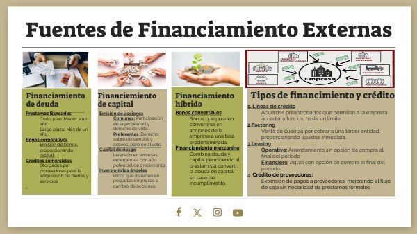 1. Líneas de créditoAcuerdos preaptrobados que permiten a la empresa acceder a fondos, hasta un límite.2.Factoring Venta de cuentas por cobrar a una tercer entidad, proporcionando liquidez inmediata. 3.Leasing Operativo: Arrendamiento sin opción de compra al final del periodo Financiero: Aquél con opción de compra al final del periodo. 4. Crédito de proveedores: Extensión de pagos a proveedores, mejorando el flujo de caja sin necesidad de prestamos formales