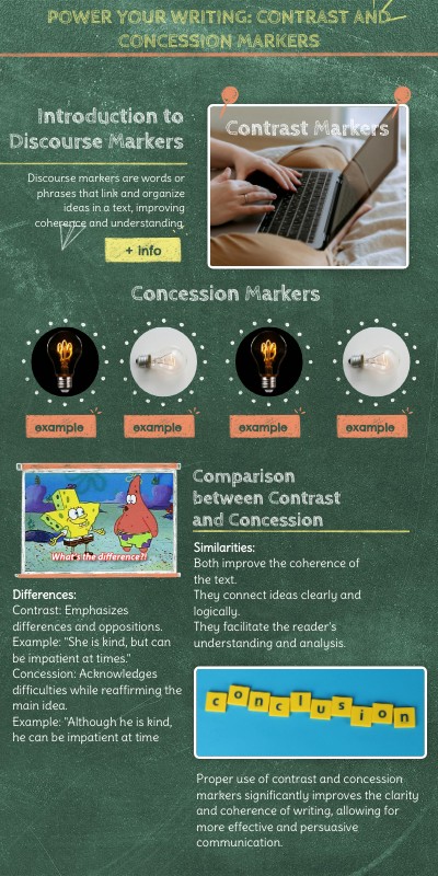 Common Words and Phrases: But: Introduces an idea that contradicts or limits the previous one. Example: "I wanted to go out, but it started to rain." However: Point out an exception to the previously mentioned idea. Example: "He studied hard; however, he did not pass." Although: Introduces an idea that contrasts with the main idea. Example: "Even though he was tired, he continued working." Despite: Indicates a contrast, highlighting the persistence of a situation. Example: "Despite his efforts, he did not succeed." Impact on Comprehension: They facilitate the comparison and critical analysis of ideas. They improve clarity in the presentation of oppositions.