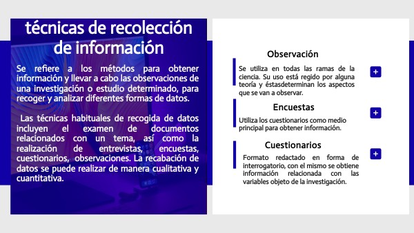 Se refiere a los métodos para obtener información y llevar a cabo las observaciones de una investigación o estudio determinado, para recoger y analizar diferentes formas de datos. Las técnicas habituales de recogida de datos incluyen el examen de documentos relacionados con un tema, así como la realización de entrevistas, encuestas, cuestionarios, observaciones. La recabación de datos se puede realizar de manera cualitativa y cuantitativa.