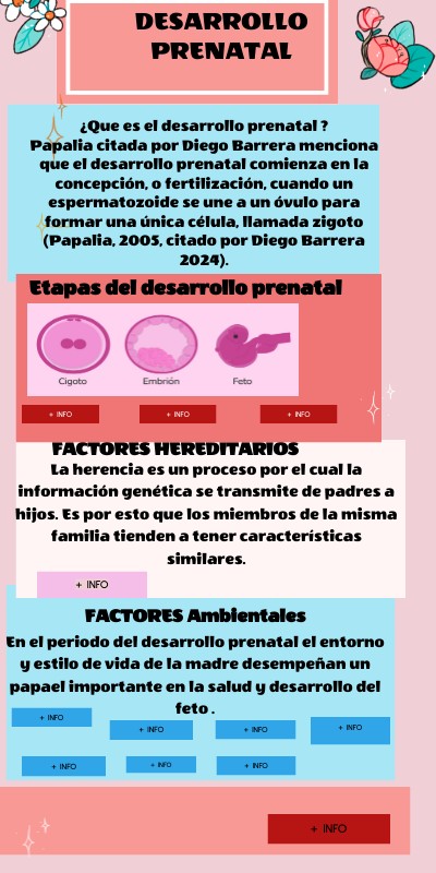¿Que es el desarrollo prenatal ?Papalia citada por Diego Barrera menciona que el desarrollo prenatal comienza en la concepción, o fertilización, cuando un espermatozoide se une a un óvulo para formar una única célula, llamada zigoto (Papalia, 2005, citado por Diego Barrera 2024).