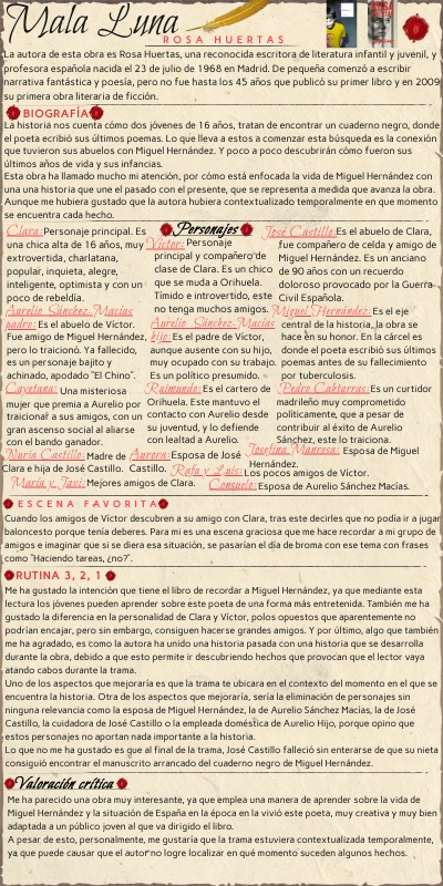 Me ha gustado la intención que tiene el libro de recordar a Miguel Hernández, ya que mediante esta lectura los jóvenes pueden aprender sobre este poeta de una forma más entretenida. También me ha gustado la diferencia en la personalidad de Clara y Víctor, polos opuestos que aparentemente no podrían encajar, pero sin embargo, consiguen hacerse grandes amigos. Y por último, algo que también me ha agradado, es como la autora ha unido una historia pasada con una historia que se desarrolla durante la obra, debido a que esto permite ir descubriendo hechos que provocan que el lector vaya atando cabos durante la trama. Uno de los aspectos que mejoraría es que la trama te ubicara en el contexto del momento en el que se encuentra la historia. Otra de los aspectos que mejoraría, sería la eliminación de personajes sin ninguna relevancia como la esposa de Miguel Hernández, la de Aurelio Sánchez Macías, la de José Castillo, la cuidadora de José Castillo o la empleada doméstica de Aurelio Hijo, porque opino que estos personajes no aportan nada importante a la historia. Lo que no me ha gustado es que al final de la trama, José Castillo falleció sin enterarse de que su nieta consiguió encontrar el manuscrito arrancado del cuaderno negro de Miguel Hernández.