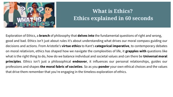 Exploration of Ethics, a branch of philosophy that delves into the fundamental questions of right and wrong,good and bad. Ethics isn't just about rules it's about understanding what drives our moral compass guiding our decisions and actions. From Aristotle's virtue ethics to Kant's categorical imperative, to contemporary debates on moral relativism, ethics has shaped how we navigate the complexities of life, it grapples with questions like what is the right thing to do, how do we balance individual and societal values and can there be Universal moral principles. Ethics isn't just a philosophical endeavor, it influences our personal relationships, guides our professions and shapes the moral fabric of societies. So as you ponder your own ethical choices and the values that drive them remember that you're engaging in the timeless exploration of ethics.