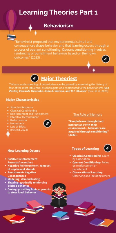 "Behaviroist proposed that environmental stimuli and consequences shape behavior and that learning occurs through a process of operant conditioning. Operant conditioning involves reinforcing or punishment behaviros based on their own outcomes" (2023) .