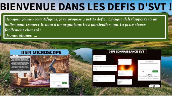Bonjour jeunes scientifiques, je te propose 2 petits défis ! Chaque défi t'apportera un indice pour trouver le nom d'un organisme très particulier, que tu peux élever facilement chez toi !Bonne chance ...
