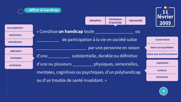 « Constitue un handicap toute _________________ ou __________ de participation à la vie en société subie ______________________ par une personne en raison d’une__________ substantielle, durable ou définitive d’une ou plusieurs _________ physiques, sensorielles, mentales, cognitives ou psychiques, d’un polyhandicap ou d’un trouble de santé invalidant. »