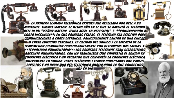 : La primera llamada telefónica exitosa fue realizada por Bell a su asistente, Thomas Watson, el mismo año en el que se patentó el teléfono. Bell dijo: "¡Señor Watson, venga aquí, lo necesito!". 3. **Comunicación a corta distancia**: En sus primeras etapas, el teléfono era efectivo para comunicaciones a corta distancia, principalmente dentro de una ciudad o entre edificios cercanos. La calidad del sonido y la eficacia de la transmisión disminuían considerablemente con distancias más largas. 4. **Tecnología rudimentaria**: Los primeros teléfonos eran dispositivos bastante rudimentarios, con un transmisor que convertía el sonido en corriente eléctrica y un receptor que convertía la corriente eléctrica nuevamente en sonido. Estos teléfonos estaban conectados por cables directos y no había una red telefónica amplia como la que conocemos hoy en día.