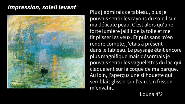 Plus j'admirais ce tableau, plus je pouvais sentir les rayons du soleil sur ma délicate peau. C'est alors qu'une forte lumière jaillit de la toile et me fit plisser les yeux. Et puis sans m'en rendre compte, j'étais à présent dans le tableau. Le paysage était encore plus magnifique mais désormais je pouvais sentir les vaguelettes du lac qui claquaient sur la coque de ma barque. Au loin, j'aperçus une silhouette qui semblait glisser sur l'eau. Un frisson m'envahit. Louna 4°2