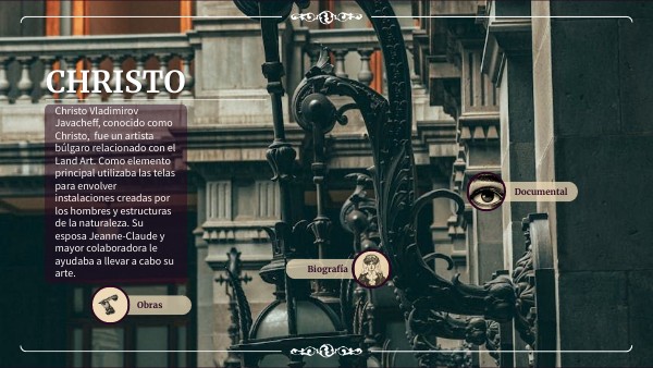 Christo Vladimirov Javacheff, conocido como Christo, fue un artista búlgaro relacionado con el Land Art. Como elemento principal utilizaba las telas para envolver instalaciones creadas por los hombres y estructuras de la naturaleza. Su esposa Jeanne-Claude y mayor colaboradora le ayudaba a llevar a cabo su arte.