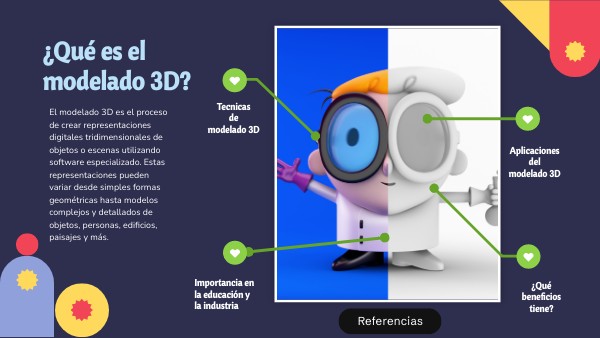 El modelado 3D tiene una amplia variedad de aplicaciones en diversas industrias y campos. Aquí hay algunas de las principales aplicaciones del modelado 3D: -Animación y efectos visuales: En la industria del entretenimiento, el modelado 3D se utiliza para crear personajes animados, escenas y efectos especiales para películas, series de televisión, videojuegos. y animaciones.