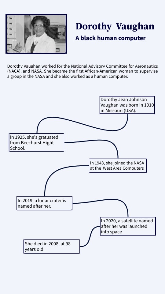 Dorothy Vaughan worked for the National Advisory Committee for Aeronautics (NACA), and NASA. She became the first African-American woman to supervise a group in the NASA and she also worked as a human computer.