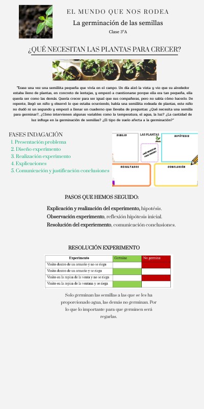"Erase una vez una semillita pequeña que vivía en el campo. Un día alzó la vista y vio que su alrededor estaba lleno de plantas, en concreto de lentejas, y empezó a cuestionarse porque ella era tan pequeña, ella quería ser como las demás. Quería crecer para ser igual que sus compañeras, pero no sabía cómo hacerlo. De repente, llegó un niño y observó lo que estaba ocurriendo, había una semillita rodeada de plantas, este niño no dudó ni un segundo y empezó a llenar un cuaderno que llevaba de preguntas: ¿Qué necesita una semilla para germinar?, ¿Cómo intervienen algunas variables como la temperatura, el agua, la luz? ¿La cantidad de luz influye en la germinación de semillas? ¿El tipo de suelo afecta a la germinación?”