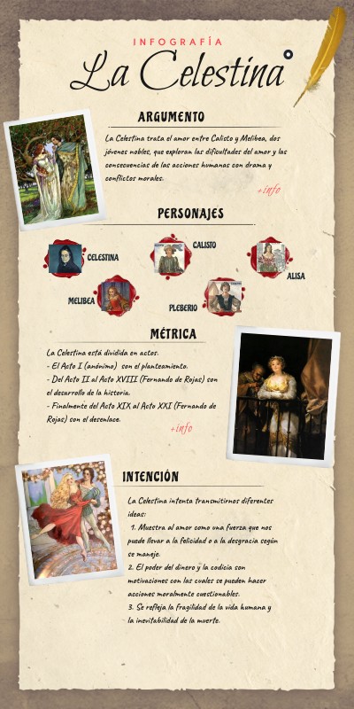 La Celestina trata el amor entre Calisto y Melibea, dos jóvenes nobles, que exploran las dificultades del amor y las consecuencias de las acciones humanas con drama y conflictos morales.