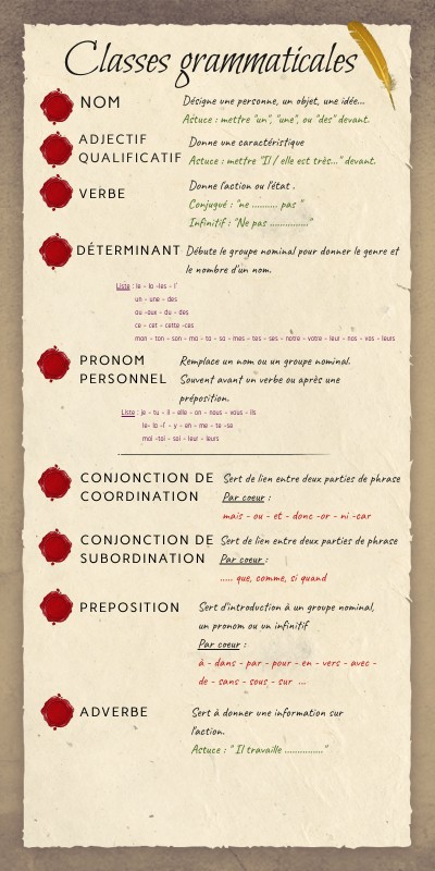 Liste : le - la -les - l' un - une - des au -aux - du - des ce - cet - cette -ces mon - ton - son - ma - ta - sa - mes - tes - ses - notre - votre - leur - nos - vos - leurs