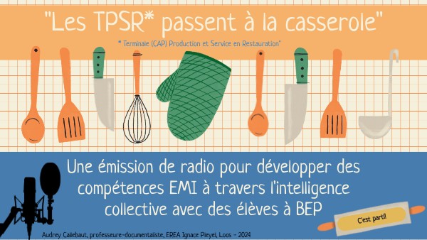 Les 2 classes ont travaillé autour d'un chef d'oeuvre commun "rendre plus durable notre restaurant pédagogique". Afin de valoriser ce chef d'oeuvre, ainsi que la filière professionnelle des élèves, l'objectif final était de réaliser une émission de radio qui réunirait les 2 classes et qui permettrait de restituer le projet de chef d'oeuvre, après une présentation de leur filière. Ce projet fait appel à l'intelligence collective dans la mesure où il nécessitait de collaborer en vue d'une réalisation commune, en tenant compte des compétences et des capacités de chacun au sein d'un groupe très hétérogène. Les conférences de rédaction ont été des moments privilégiés de mise en oeuvre de cette intelligence collective. Le projet a permis de développer des compétences EMI, des compétences disciplinaires, des compétences comportementales et des compétences psycho-sociales.