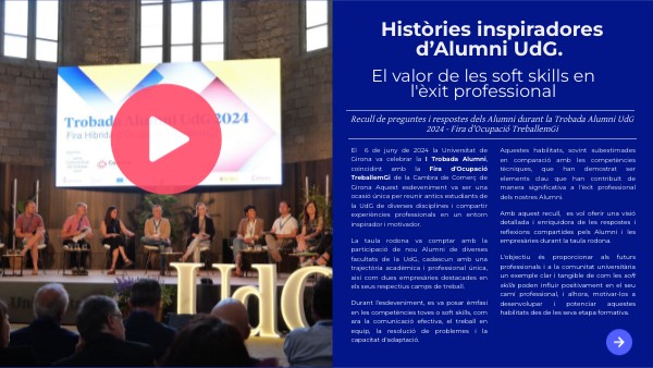 Aquestes habilitats, sovint subestimades en comparació amb les competències tècniques, que han demostrat ser elements clau que han contribuït de manera significativa a l'èxit professional dels nostres Alumni. Amb aquest recull, es vol oferir una visió detallada i enriquidora de les respostes i reflexions compartides pels Alumni i les empresàries durant la taula rodona. L'objectiu és proporcionar als futurs professionals i a la comunitat universitària un exemple clar i tangible de com les soft skills poden influir positivament en el seu camí professional, i alhora, motivar-los a desenvolupar i potenciar aquestes habilitats des de les seva etapa formativa.