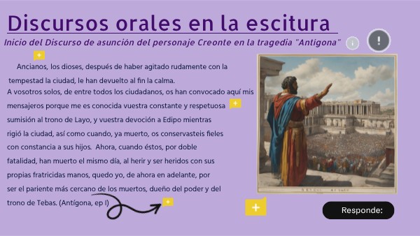 1- ¿Qué aspectos del discurso podrían considerarse influenciados por el hybris? 2- Lee el resto del discurso y resume el argumento principal de Creonte.