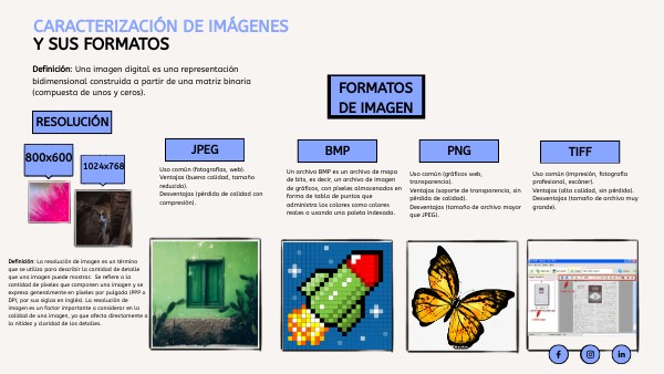 Uso común (impresión, fotografía profesional, escáner). Ventajas (alta calidad, sin pérdida). Desventajas (tamaño de archivo muy grande).