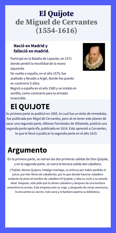1ªSalida: Alonso Quijano, hidalgo machego, se enfusca por haber perdido el juicio, por leer libros de caballerías, por lo que decide hacerse caballero andante.Se pone el nombre de caballero El Quijote, y idea su rocín y su amada ideal. Después, este pide que lo almen caballero y despues de una burlona ceremónia lo arman. Este empieza solo su viaje, y despueés de varias aventuras, lo encuentra su vecino. Este sana y el barbero quema su biblioteca.